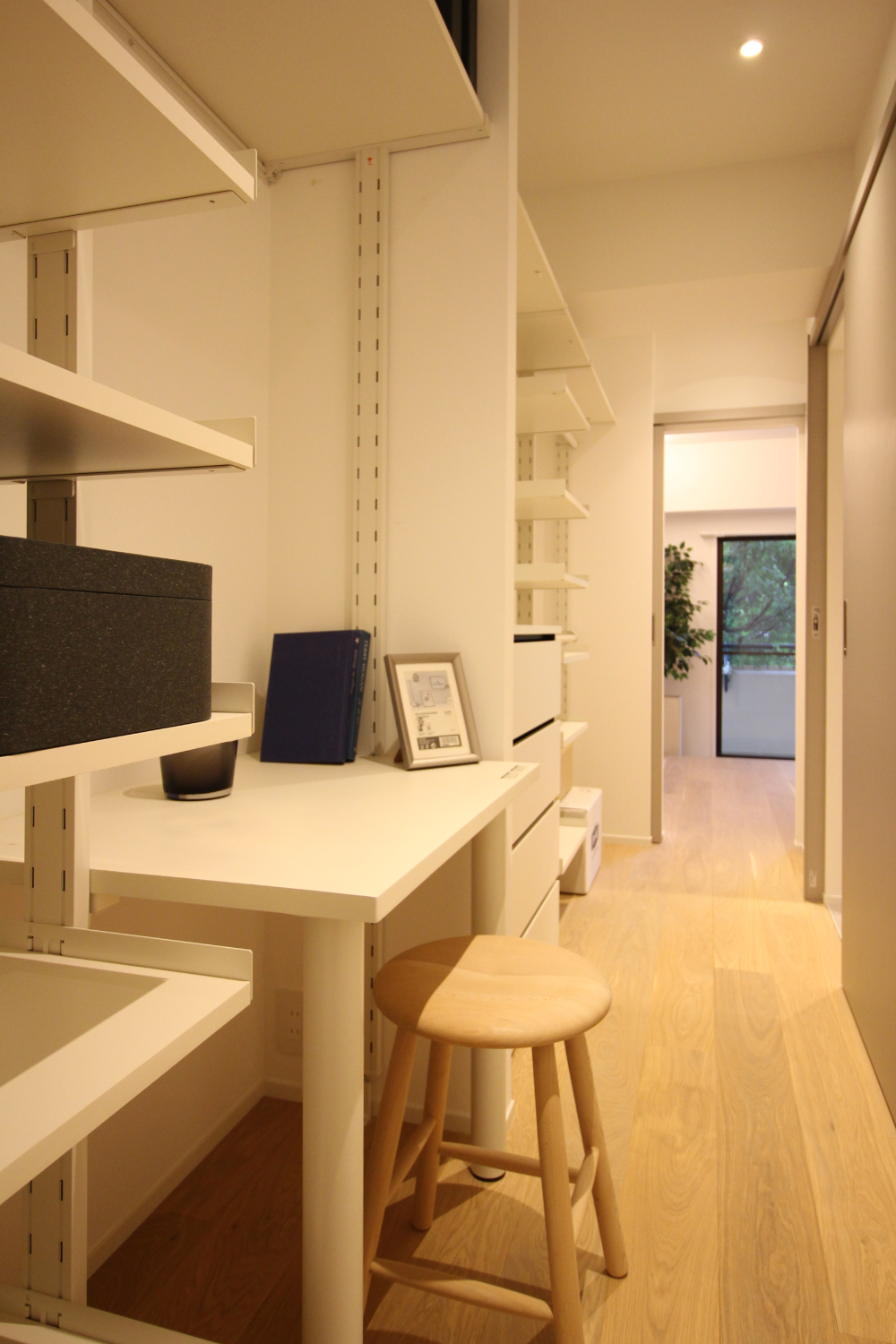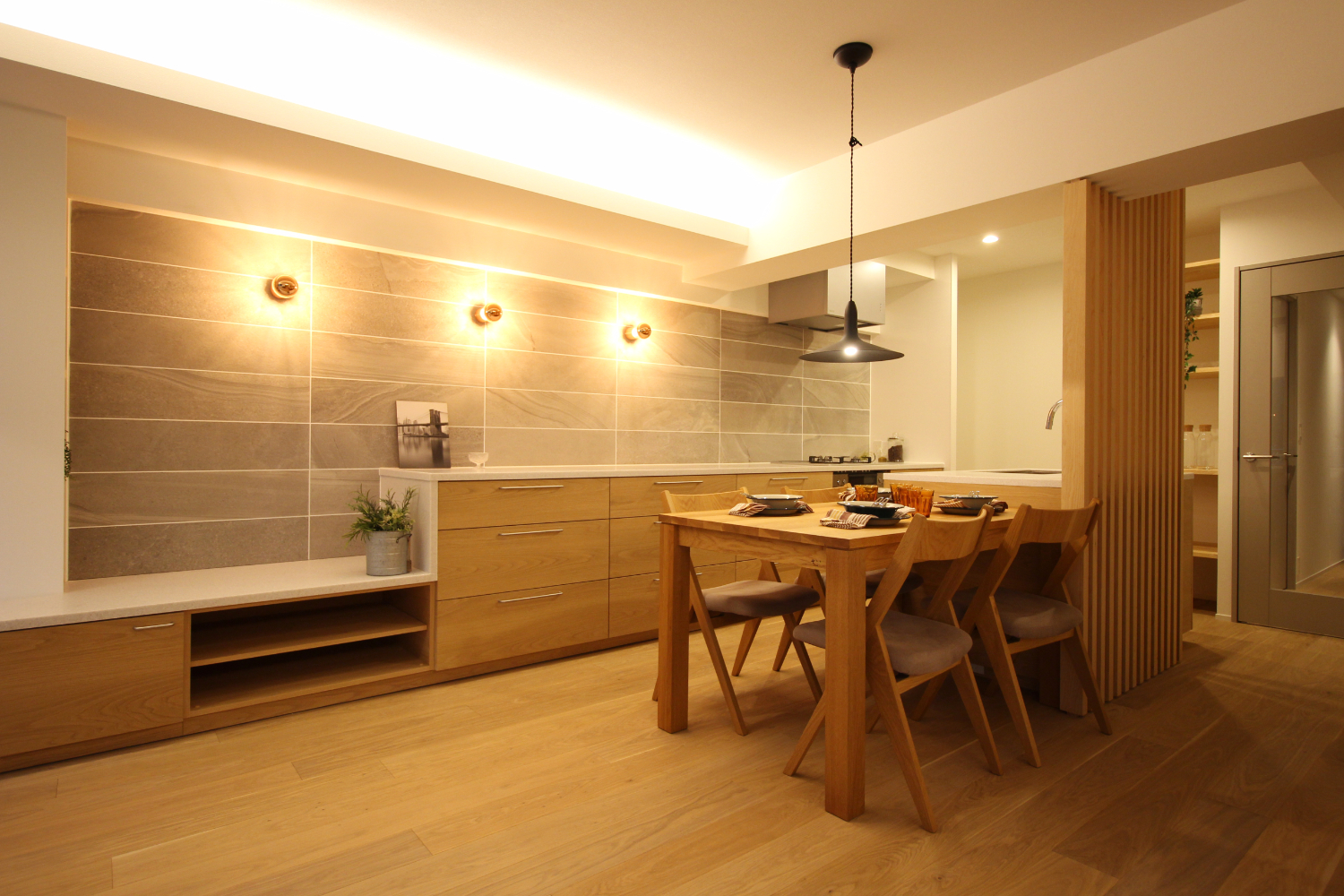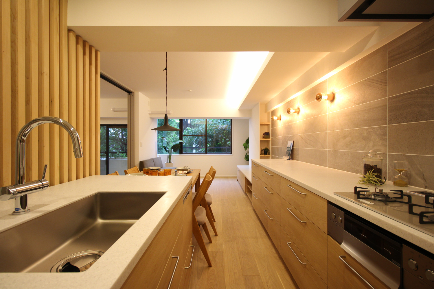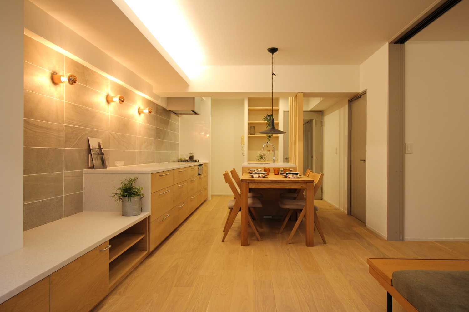 キッチンは、二の字型の製作キッチンを計画。長いキッチンカウンターは高さを調節し、TV台まで連続するデザインとした。